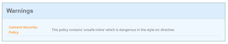 The warning here is given because I have the 'unsafe-inline' value in my CSP style-src directive, allowing me to use inline styles on the page. Sites will sometimes do this because it's convenient, because they use a theme that requires it, because one of the libraries they use requires it, or a whole bunch of other reasons. An inline style might look like one of the following: