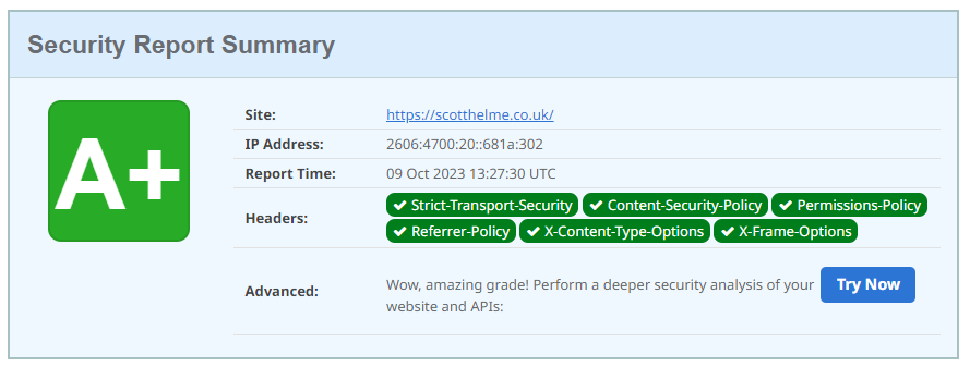 To be clear, a site will still have had to put serious thought and effort into the configuration of their Security Headers, but now, I think the A+ grade means you've achieved something that I'd be happy if all sites were to achieve.
