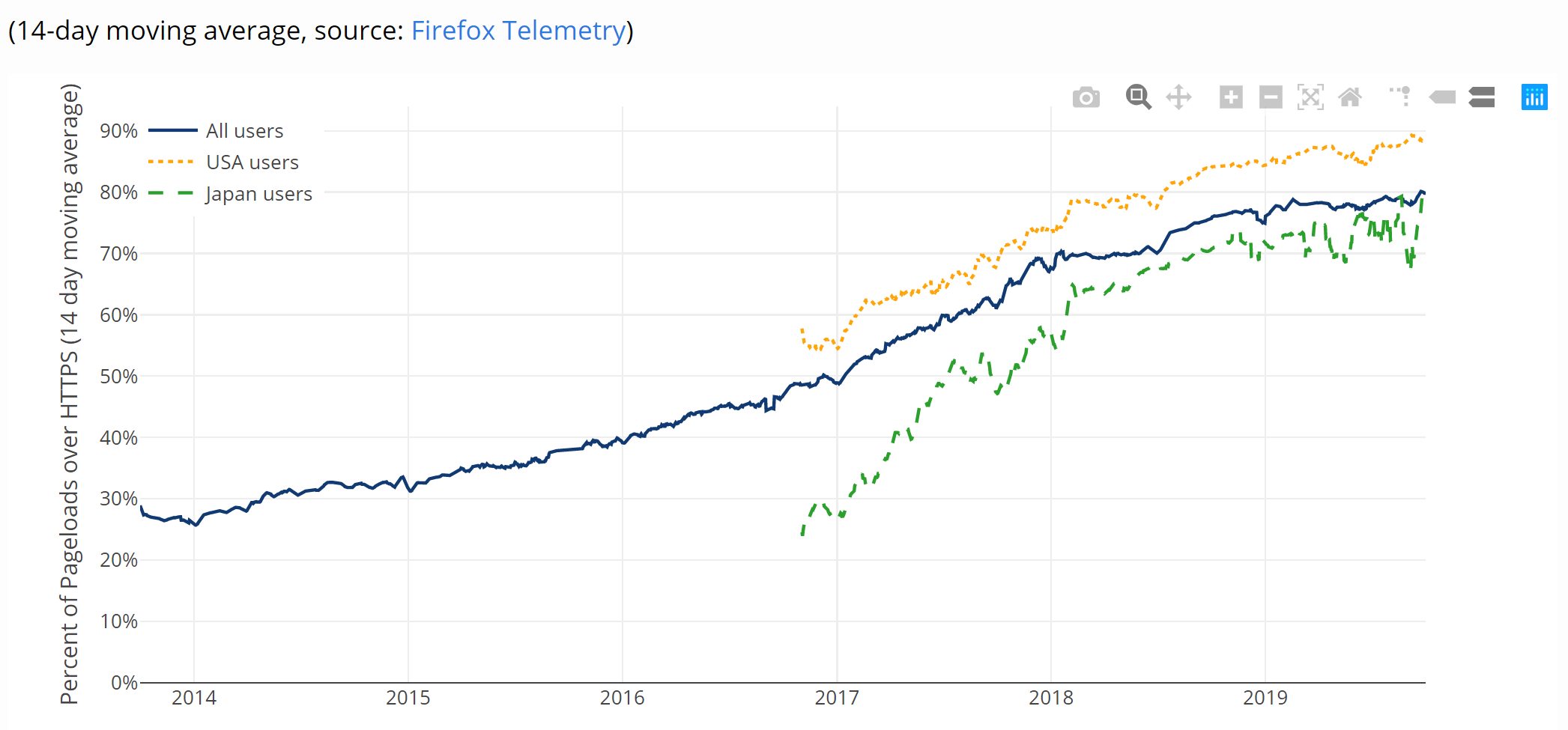 The adoption of HTTPS on the Web has seen huge increases recently and we can see evidence of that all around us. My own reports on the top 1 million site, most recently in September, show that and so do browser statistics from the like of Mozilla. Here is the % of pages loaded in Firefox that use HTTPS: https://letsencrypt.org/stats/#percent-pageloads