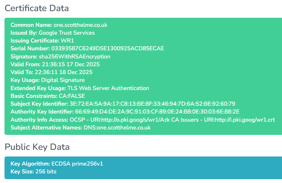 acme.sh --issue --dns dns_cf -d one.scotthelme.co.uk --keylength ec-256 --server https://dv.acme-v02.api.pki.goog/directory --extended-key-usage serverAuth --valid-to '+1d'Yes, that command does work, and yes you do get a ONE-DAY CERTIFICATE!!