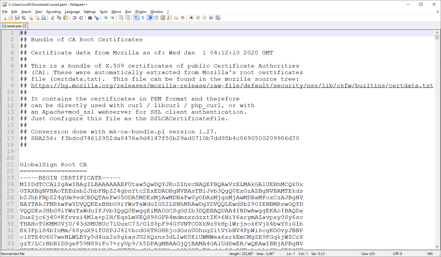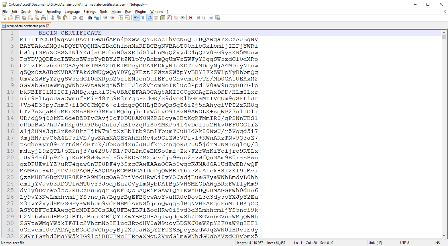 To get started we're going to need a few things and the first on the list is a Root Store that we can build chains down to, these will be our ultimate Trust Anchors. I decided to use the Mozilla CA Certificate Program's list of Included CA Certificates which you can download here but the format is a little raw. To save myself having to do anything with that file I'm instead going to use the list extracted and converted to PEM by Daniel Stenberg here. That gives me a list of 138 Root CA Certificates at the time of writing.