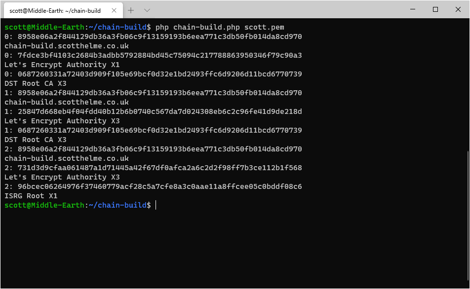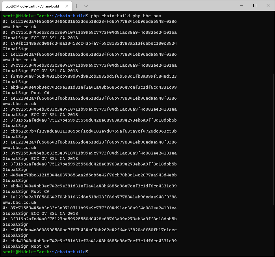 The output here shows the leaf certificate, all intermediates and then the root for each chain that was built. Analysing the 3 chains we have: