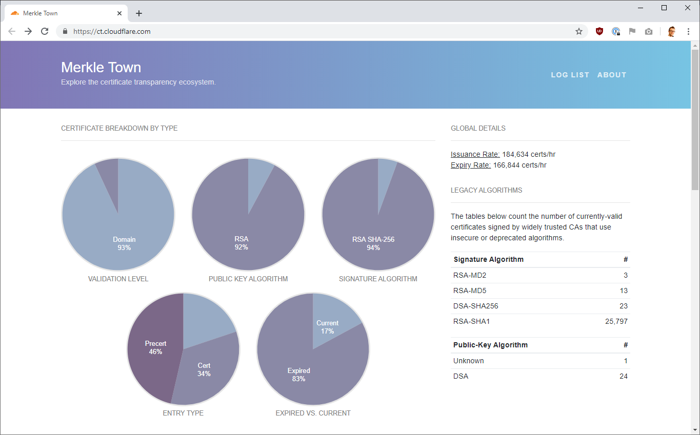 The first such tool I'm going to look at is Merkle Town, a CT dashboard created and hosted by Cloudflare.