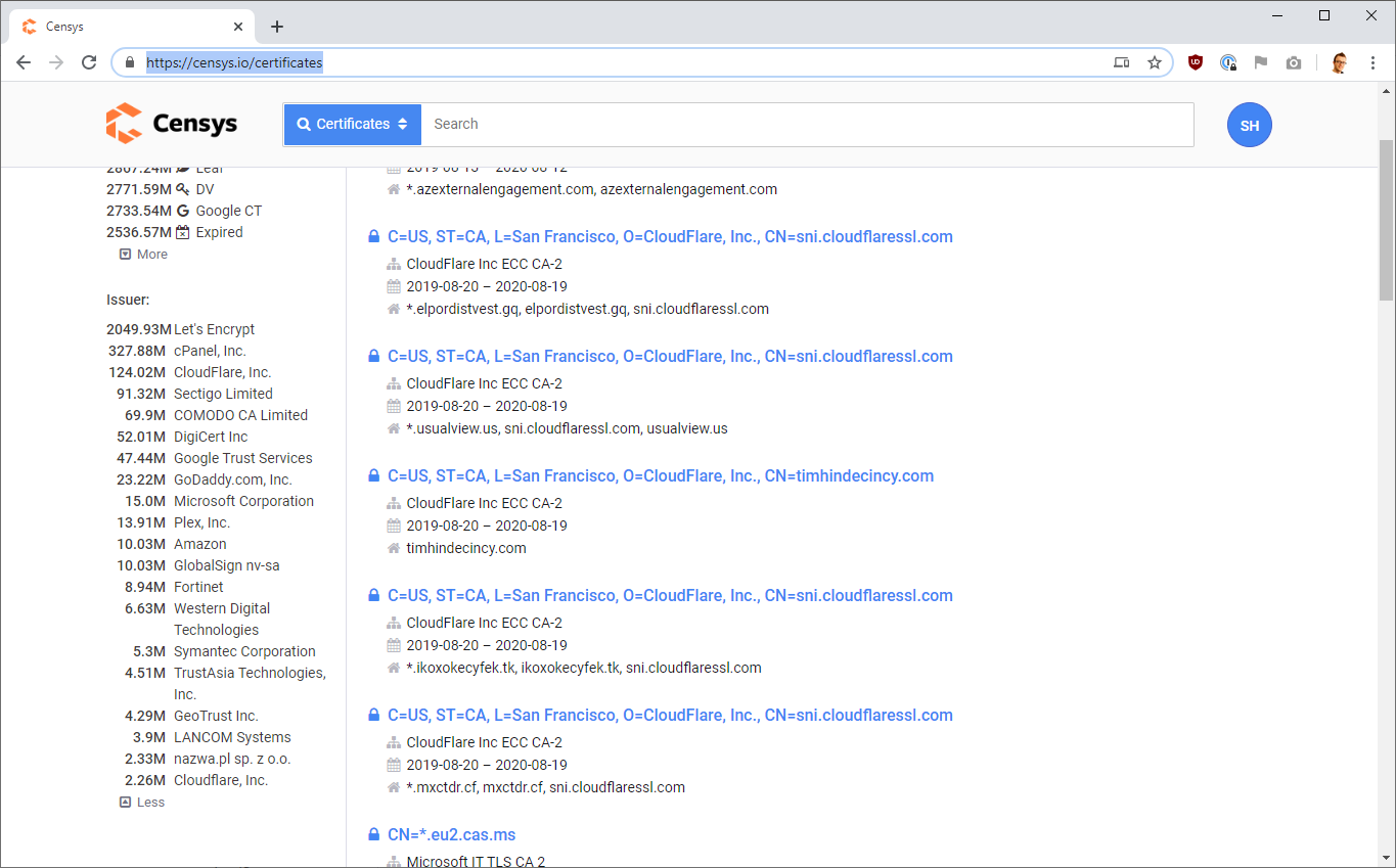 You can see here that Censys provide a list of the most common issuers of certificates along with the number of certificates they've issued.