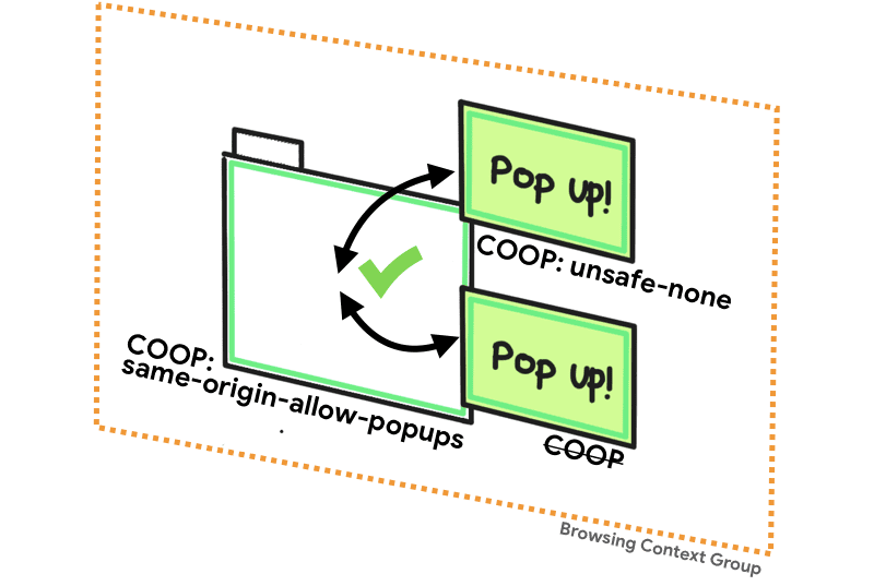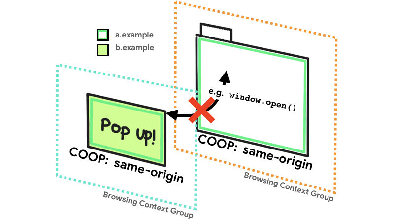 Cross-Origin-Opener-Policy: (same-origin|same-origin-allow-popups|unsafe-none); report-to="default"When setting the same-origin value, our page can only share a browsing context group with other pages from our own origin that have also set a COOP header with same-origin. You can see here that b.example is opened in a new browsing context group because is it not the same origin as a.example.