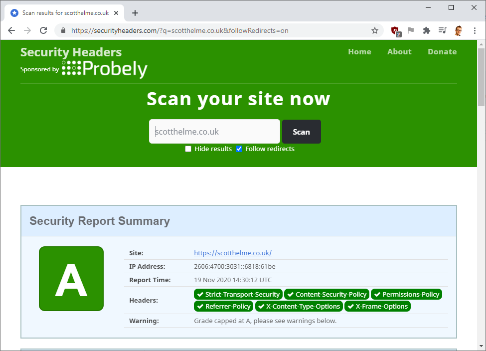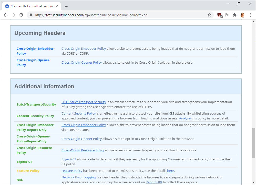 I've talked about the X-Content-Type-Options header in the past and the Security Headers scanner also advises that websites set the XCTO header too. Hopefully this shouldn't be too difficult and the header has been around for a very long time.