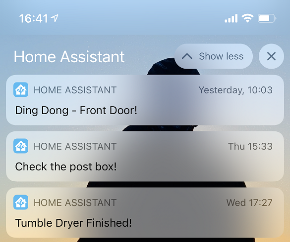 The tumble dryer notification comes from a Shelly smart relay that does power monitoring and previously from a TP-Link Kasa smart plug. The Shelly relays are really cheap and easy to configure and you can trigger alerts based on anything you like.