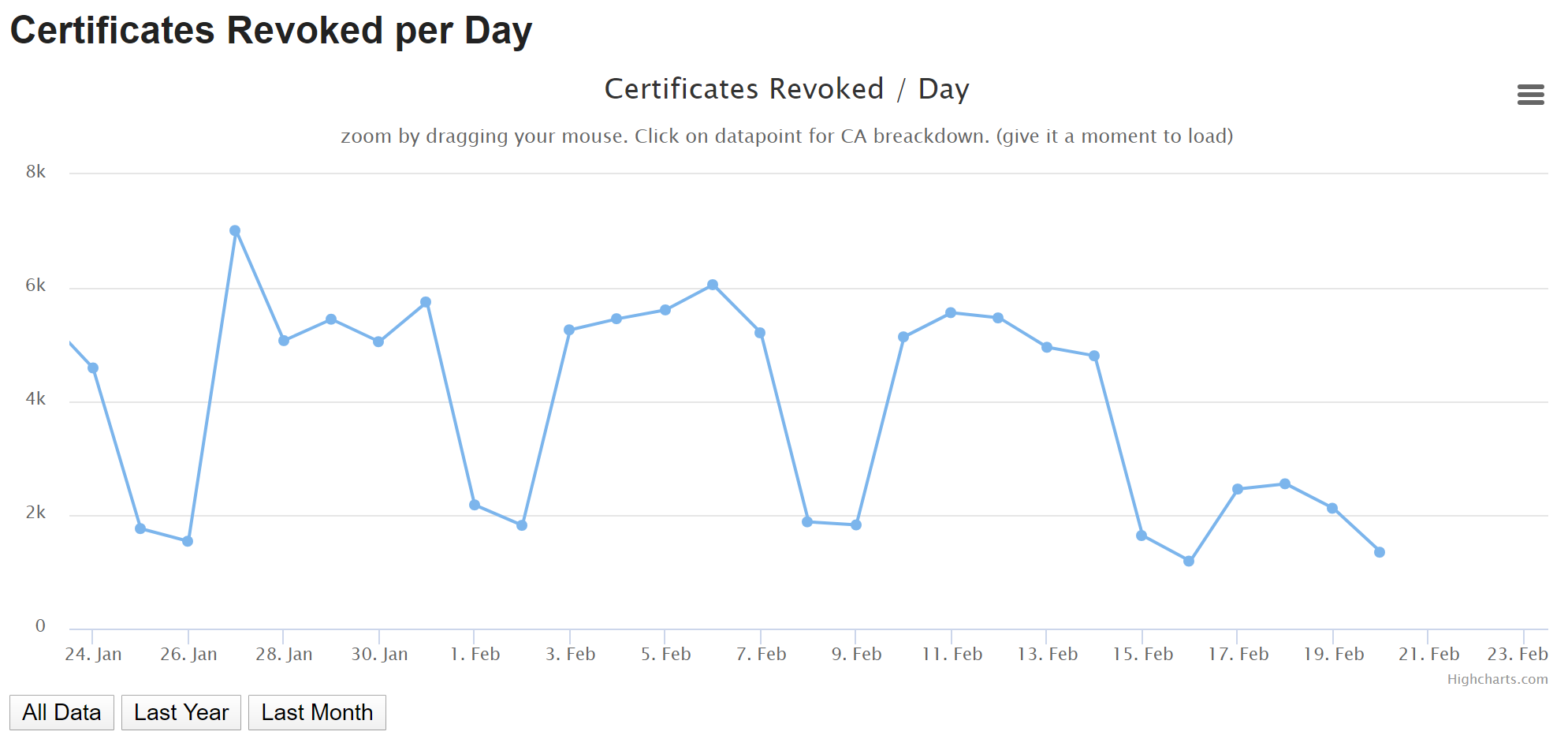 If you keep pumping all of these new revocations into the CRLs then they're going to see a big spike in size and they did. The more interesting point to note is that if you look at the current rate of certificate revocations we're far exceeding the daily rates from 2014 even if you include Heartbleed!