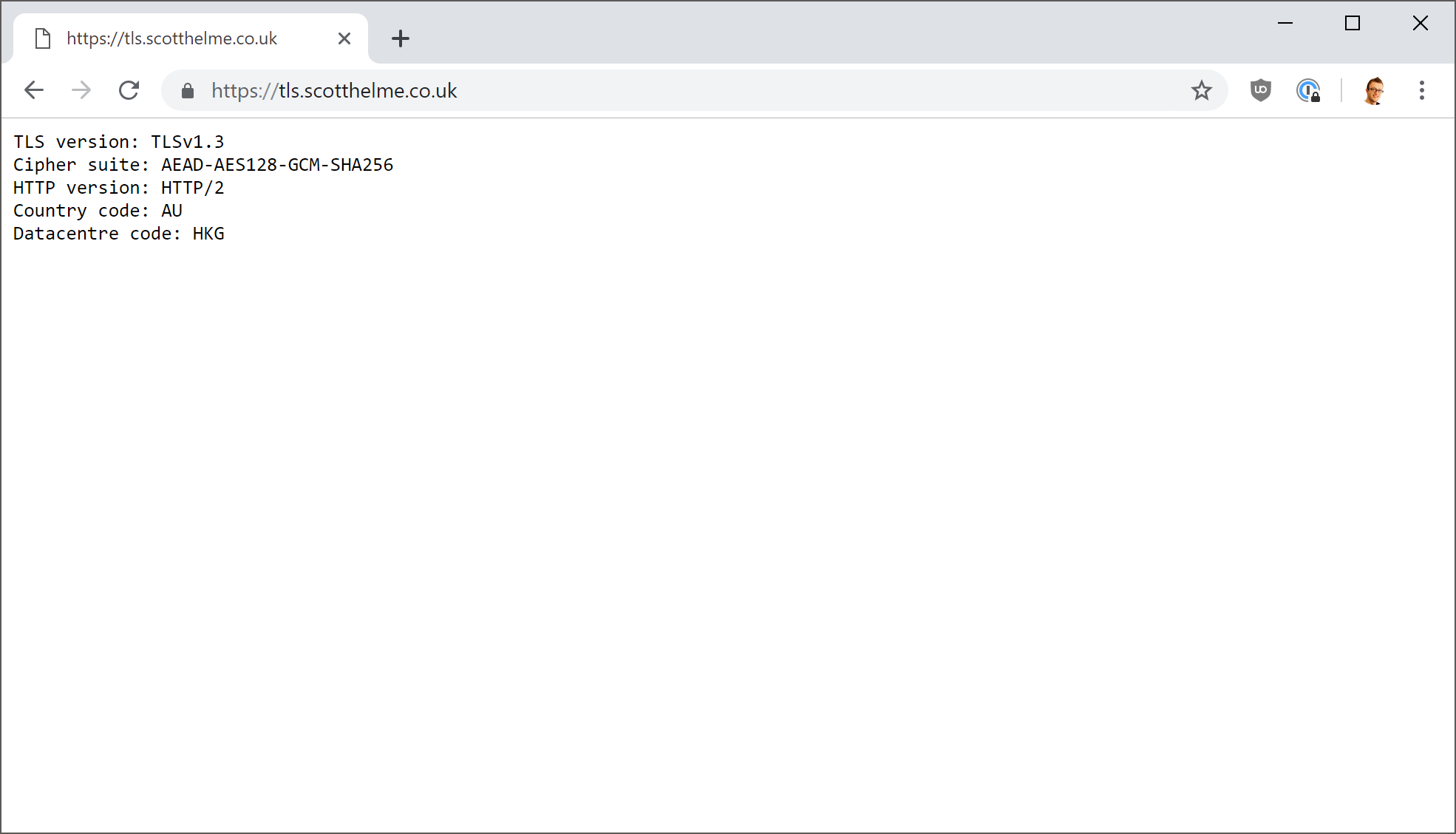 Because it's so easy to do things for fun with Cloudflare Workers, I decided to throw up a little test page on tls.scotthelme.co.uk that shows you some of the information about your connection to my site.
