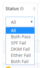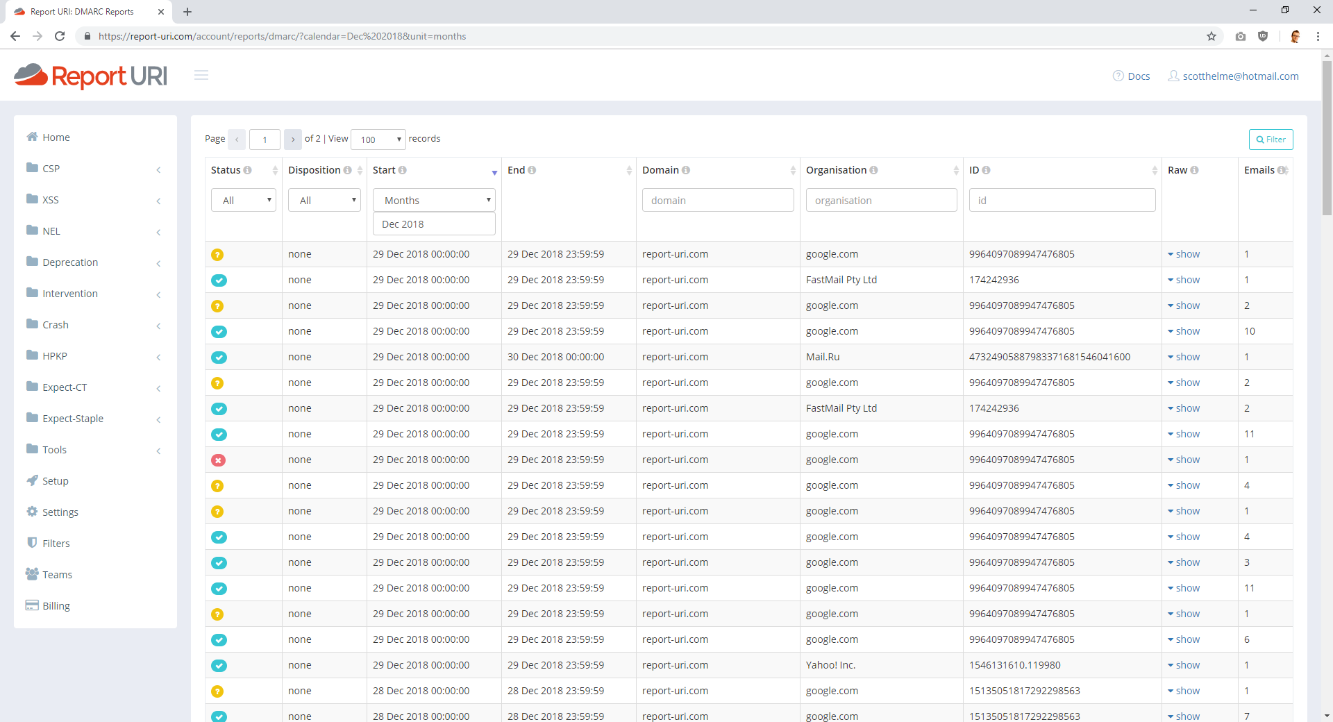 These are the reports for report-uri.com and at a glance there's a lot of information. Each row represents a report from the organisation listed about what happened to your emails that they received. Google are really good at sending DMARC reports and provide reliable information about your activity. The Status column on the left gives you a good idea of what's going on and a green tick indicates that SPF and DKIM passed, a yellow question mark indicates either SPF or DKIM failed and a red cross means that both SPF and DKIM failed. You can also filter on any of those possibilities in the Status drop down field.