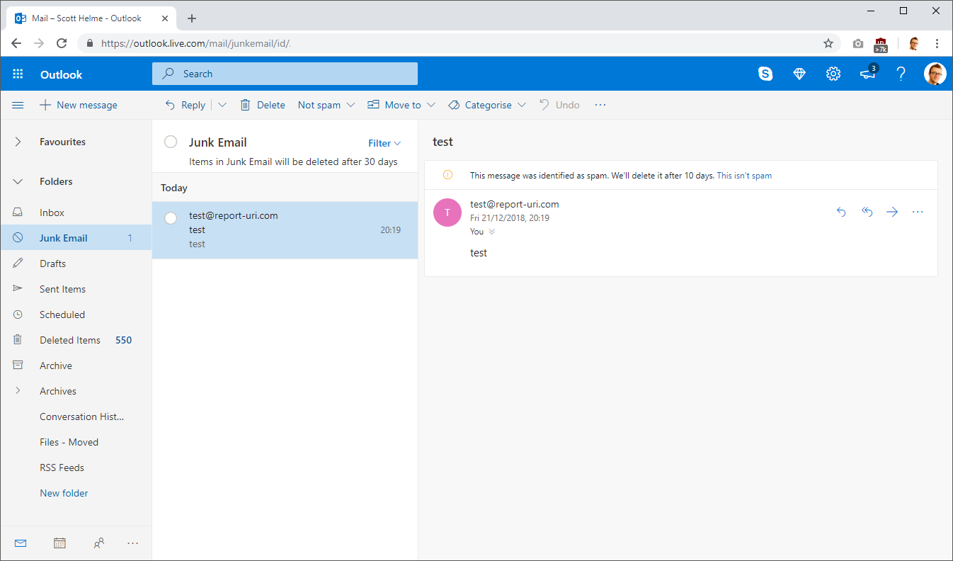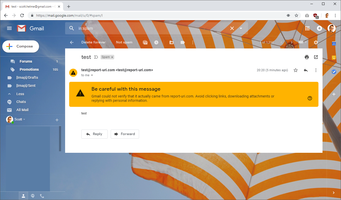 These emails were sent from a temporary server that I created and as a result the IP address of the server was not whitelisted in my SPF policy and it also can't sign emails with DKIM either. My DMARC policy requests that emails that fail either SPF or DKIM be marked as spam and not delivered to the inbox of the recipient, which is what happened here as you can see. That's great, it means someone trying to impersonate report-uri.com is already going to have their emails flagged, but we'll demonstrate what else DMARC can do.
