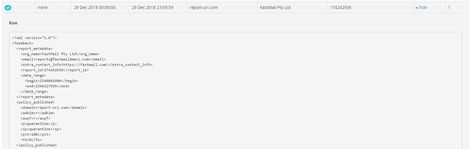 The last thing to point out here is the Raw view for the report and just like other reports we collect, we also provide the raw data for DMARC reports too.