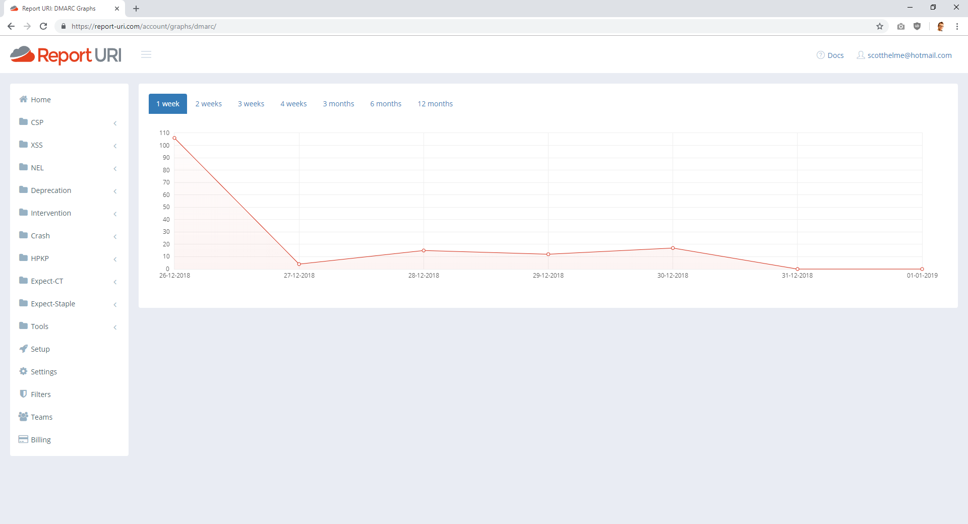 You may notice that DMARC reports are XML and not JSON like other browser based reports and you'd be right. They are also delivered via email as we've seen and not HTTP POST requests like other reports. Both of these factors introduced many new problems for us to deal with in processing these reports, and I will touch on some of them later in the post. For now, though, the last thing to show is of course the Graphs page, keeping in line with other reports.