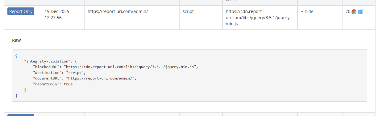 Integrity-Policy-Report-Only: blocked-destinations=(script), endpoints=(default)This will ask the browser to send a report for any script that is loaded without using SRI, and then, of course, we can go and fix that!