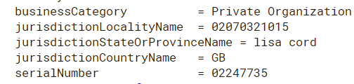Another interesting one was these certs which seem to have the company phone number present instead of the company number. Close, but not close enough.