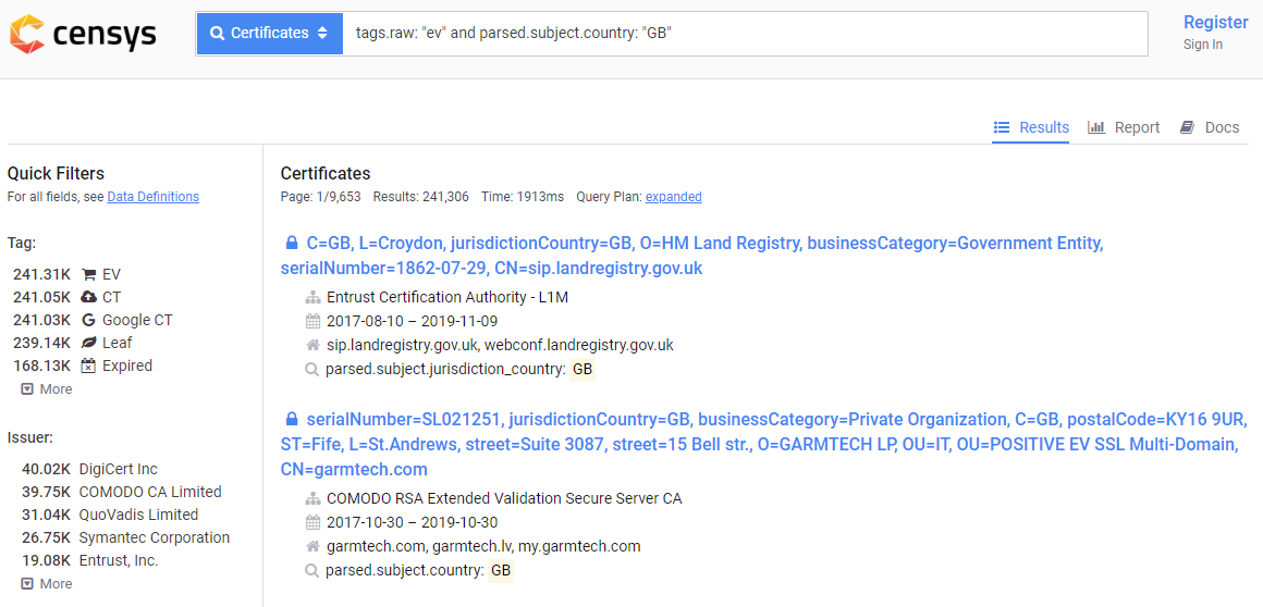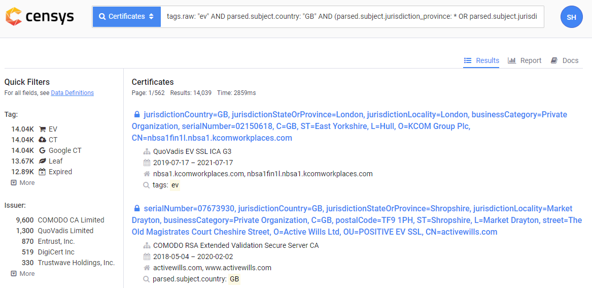 I've talked about CT a lot on my blog but if you're not familiar with CT you should check out my blog on Certificate Transparency, an introduction. One thing that we can do with CT logs is search all certificates for things that we're interested in. For example, here is a query that returns all EV certificates where the country code for the organisation is "GB", which is all EV certs in my country that I might be interested in looking at...