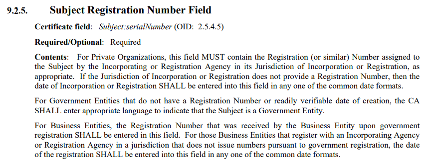 Now, Subject is the technical name for the organisation that applied for the certificate so the Subject section of a certificate contains all of the details about that organisation. The serialNumber field within the Subject section of the certificate should contain the organisation's company or registration number. The appropriate section of the EV Guidelines is 9.2.5 which outlines in detail what is required.
