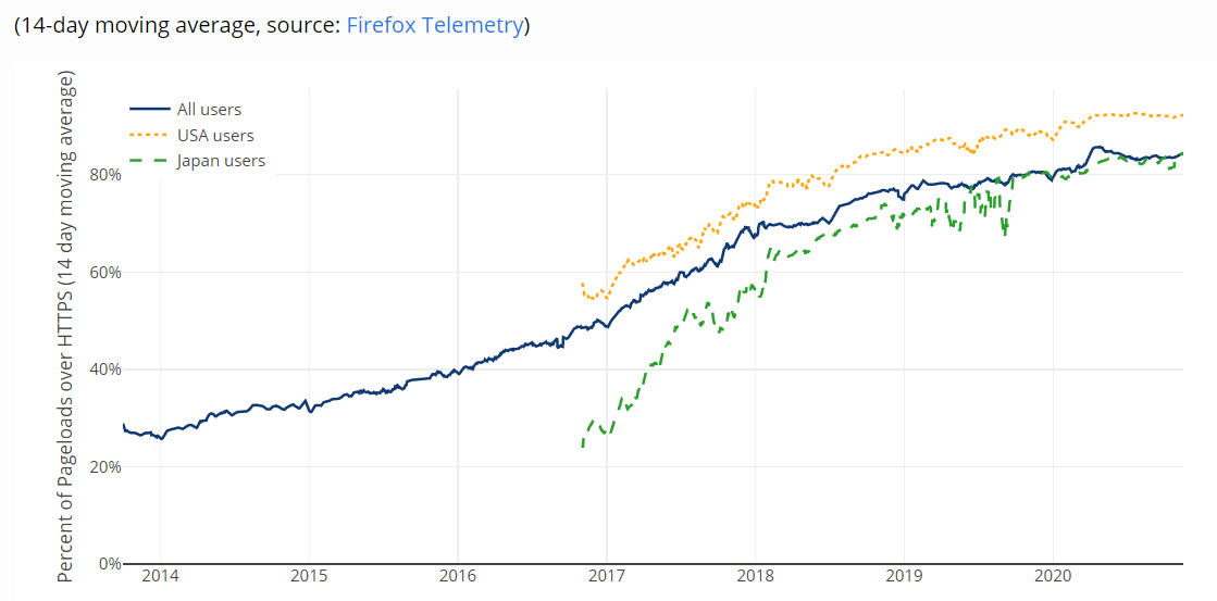 No matter where you live in the World, the data shows that over 80% of the pages you load in Firefox are HTTPS and that number can go as high as 92%, so we're off to a great start. If you're using Firefox perhaps you can give it a try and report any issues you find? For now though, let's just sit back and realise that only a few years ago this idea would have seemed like madness, yet here we are today enabling it.