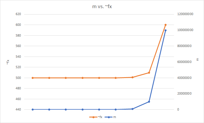 The last thing in our control is the number of items in the Sketch, m. Remember earlier that we said Pr(~fx <= fx + ϵm) <= 1 - 𝛿 and I drew attention to how the estimated frequency (~fx) that the CMS will tell us is less than or equal to the true frequency (fx) plus the error tolerance multiplied by the number if items in the data stream (ϵm) with a certain probability (1 - 𝛿)? Well, as we add more items to the CMS, we increase the chance that hash collisions will again start to increase counts for other items. A CMS is somewhat resistant to this as we are storing multiple counts for each item, but it is still a factor as we increase the number of items. It's also worth pointing out that m is the number of unique items and not the number of increment operations. If we have 1 item with a count of 1,000,000, then m = 1, but if we have 1,000,000 items with a count of 1, then m = 1,000,000. The inaccuracy of ~fx is then directly related to m and is shown here with: