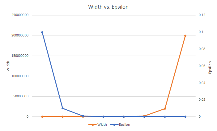 With all of that done, we can now determine the values we'd like for the dimensions of our sketch. Here are a few examples showing the ϵ and 𝛿 values (explained in the Bloom Filter blog post) in the first two columns, which can be plugged in to generate w and d, and the total amount of integers the array will need to store in the third column.