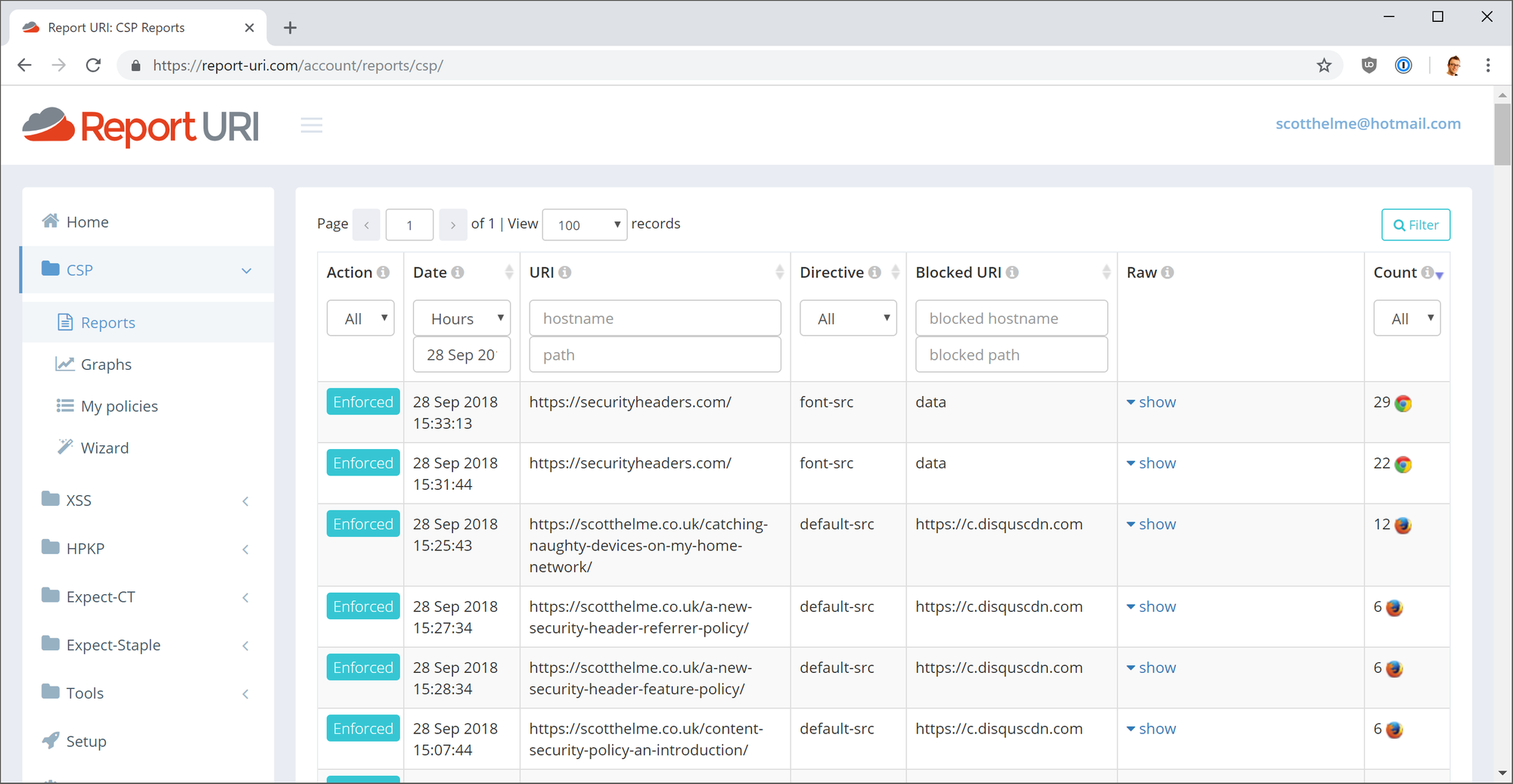 A page like that would result in a really simple query that looks like this where simply fetch all CSP reports for the current hour.