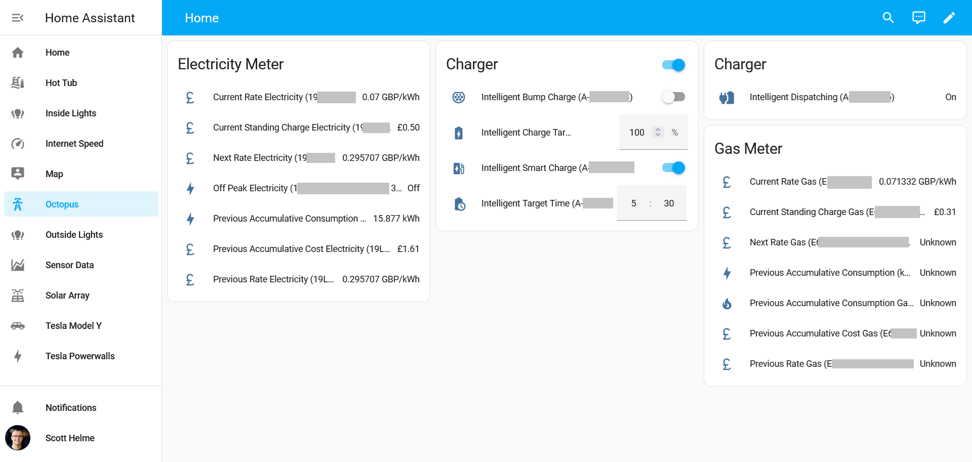 Finally, our energy supplier has a pretty cool API, and there's an integration for that in Home Assistant too! We can see a whole bunch of different data about our gas and electricity supply, and, crucially, the current rate we're being charged for electricity!