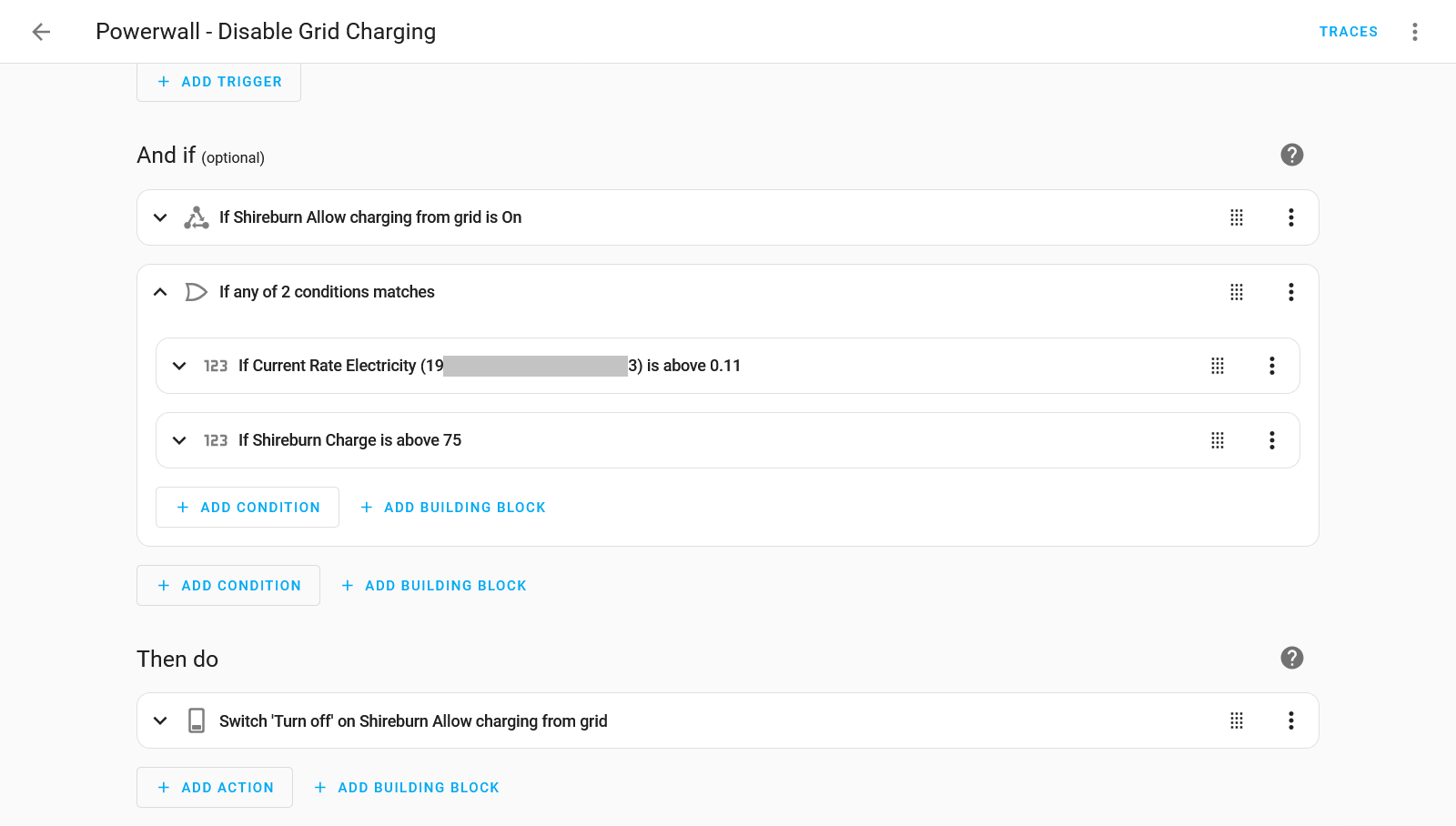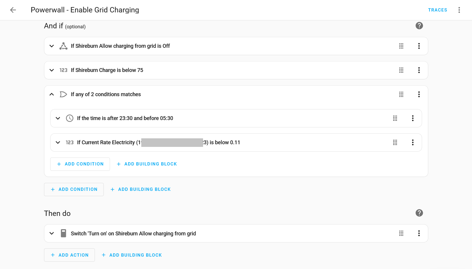 The automation to enable grid charging is then of course very similar, checking for energy cost and SoC target, and then enabling grid charging when required.