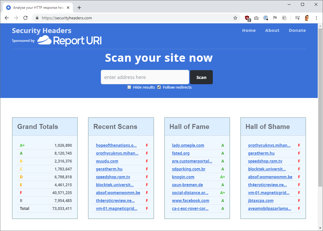 If you're not familiar with Security Headers, it's my free service that allows you to quickly and easily scan your website to see if your HTTP response headers are configured properly and what security features you're using.