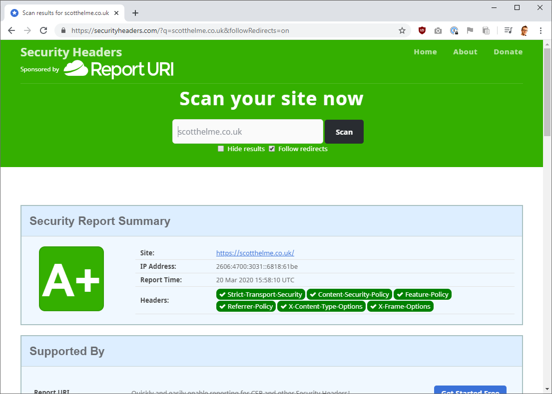 One of the things you might notice in those screenshots is that my other project, Report URI, is currently sponsoring Security Headers! I want to keep Security Headers running and free for everyone to use and for that it needs a sponsor! That being said, having one of my projects sponsor another one of my projects doesn't result in a net positive on the support front.
