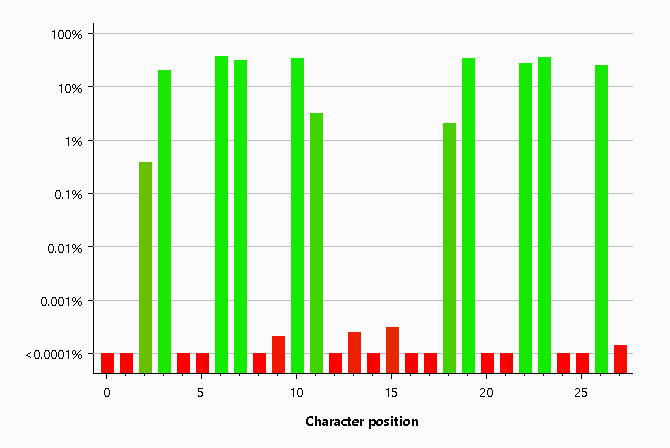 What was even more interesting was looking at how much entropy there was for each bit and character in the nonce itself. There's a low value for the start of the string given the base64 pattern explained above, and that Burp pads tokens that are shorter than the expected size. There's also a lack of entropy in the middle of the string where the comma separates the two different 32bit numbers.