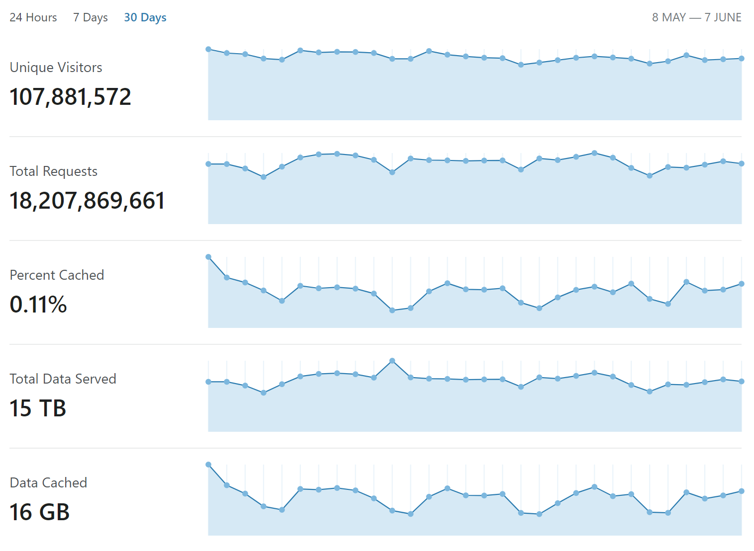 The caching above does of course introduce a small delay in both applying a lockdown and removing a lockdown from a user. Given the significant advantages of this approach and the load it removes from our origin, this seems like a reasonable tradeoff. Once a user is placed on lockdown the update will slowly start filering out into the caches and then Workers at Cloudflare datacentres around the world and results in a surprisingly smooth decline in traffic for that user over the period of a couple of hours. The same also happens when a lockdown is removed and the caches and then Workers in each location receive the udpated status and slowly start to let traffic pass through to the origin again. This is particularly handy at the start of the month when all of our users get their brand new quota and the flood gates open!