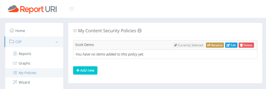 In the My Policies section of Report URI, I'm going to create a new policy called "Scott Demo" and enable the Wizard.