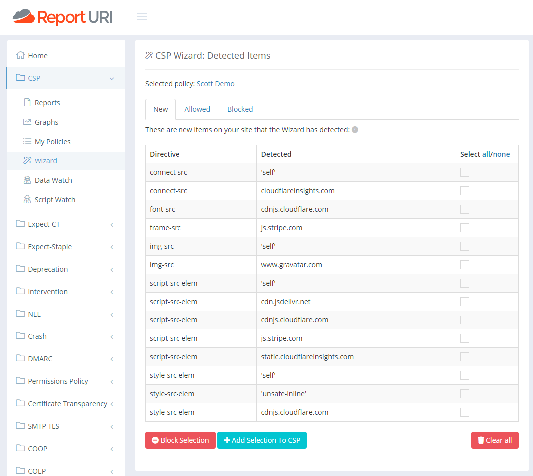 You'll need to click around a few pages on your site to make sure you're exercising all of the functionality, and by just skipping around a few pages, I managed to get a few more items reported. For example, my Disqus comment system only loads on blog posts and doesn't load on the homepage, for obvious reasons. I also only have YouTube videos embedded in certain blog posts so only those pages would report them. This is why we generally advise to deploy the CSP Wizard in production for a day or so, but in just a few seconds, I've gathered a heap of feedback about the resources on my site.