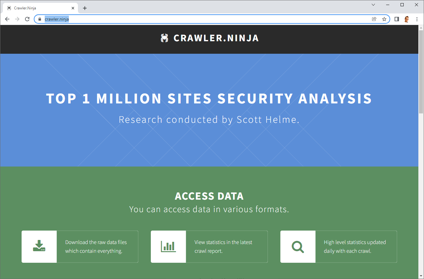 Every single day, my Crawler.Ninja project scans the Top 1 Million sites in the World and conducts a security analysis. The daily summary of these scans is available every day and terabytes of historic data is available going back years!
