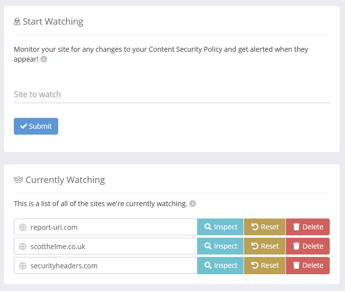 Policy Watch is an evolution of this product line, but rather than analysing your telemetry stream for new dependencies or behaviour on your page, it's analysing the Content Security Policy that you delivered with the page. Of course, a Content Security Policy can only be effective if it is present, and, detecting any changes to your policy could indicate tampering that is indicative of a bigger problem.