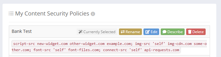 Along with being able to track changes to your policy, both in the forms of additions, deletions, or modifications, we can also map the original policy back to a CSP that you're managing on our platform in the My Policies section too. Here's the CSP I'm delivering across my site being monitored for the duration of time that I've had Policy Watch enabled, which is almost a month now.