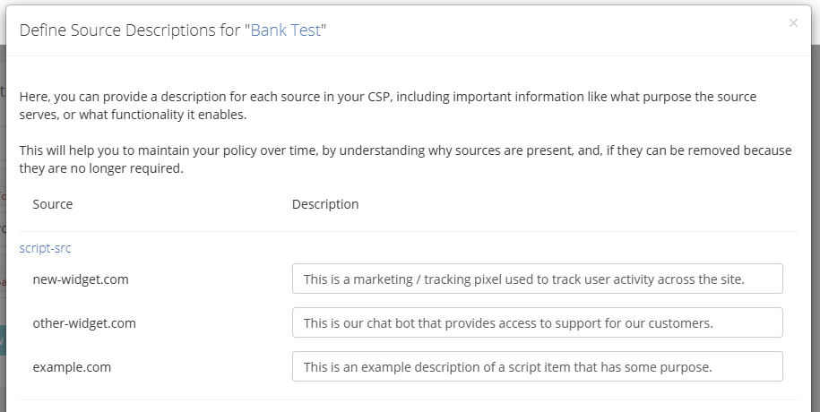 When clicking the Describe button, you can then enter a description for each individual item in your CSP to understand what it is, and why it is necessary, satisfying the PCI DSS requirements.