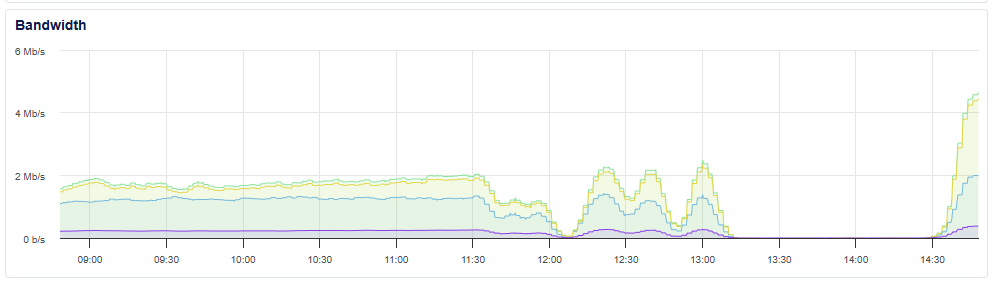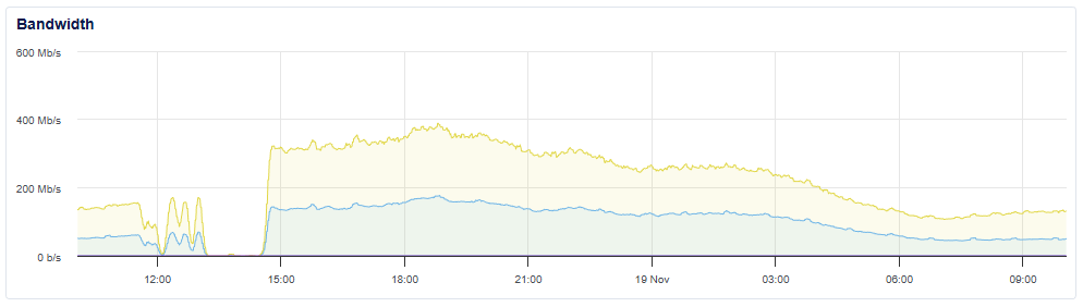 Because all of the telemetry events sent to us have to pass through Cloudflare first, when Cloudflare were experiencing their service issues, it did prevent telemetry from reaching our servers. If we take a look at the bandwidth for one of our many telemetry ingestion servers, we can clearly see the impact.