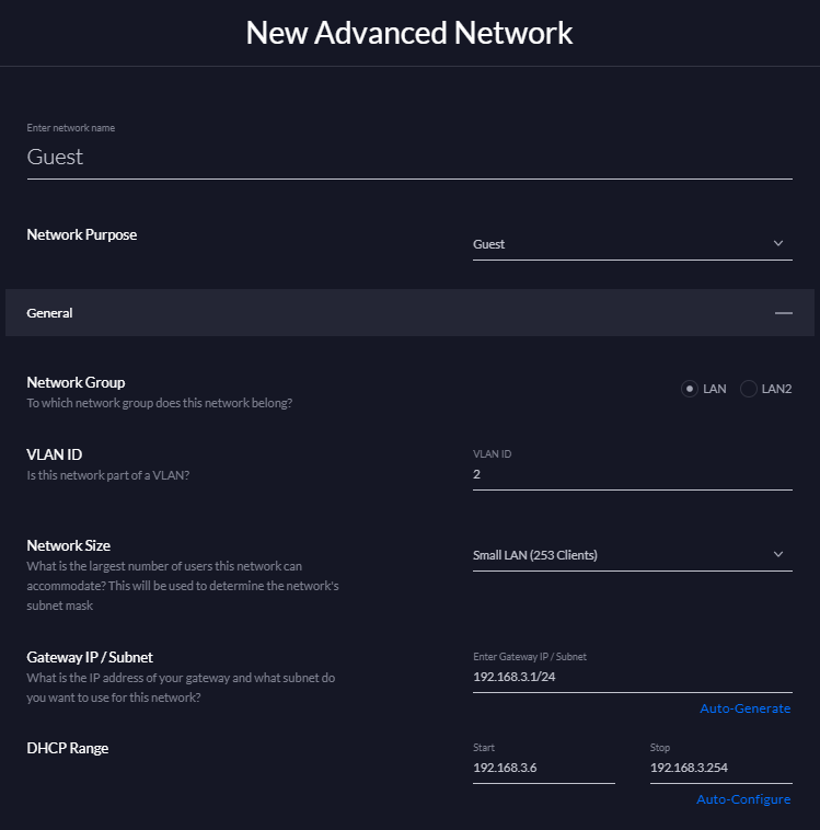 Click Create Advanced Network and then fill out a Name, make sure the Network Purpose is set to Guest, give it a VLAN ID of 2 or higher if that's already taken and click Done.
