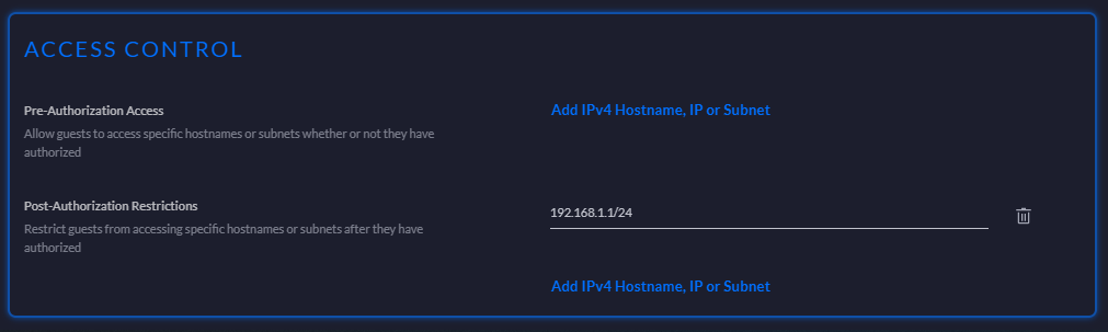 Once that's done the last step is to prevent devices on the guest network from talking to devices on the main network so go to Settings, search for Guest Control and then select the Access Control section. For Pre-Authorization Access you don't want to allow the guest network to talk to anything and for Post-Authorization Restrictions you want to add the IP range for your main network which will be 192.168.1.1/24 unless you've changed it. This means that devices on the guest network can no longer talk to devices on your main network at any time.