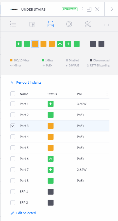 It's plugged in to the switch in my cabinet under the stairs on port #3 but is connected to the LAN network which is my main LAN. If I click on the switch port number it opens up the settings window for the switch.