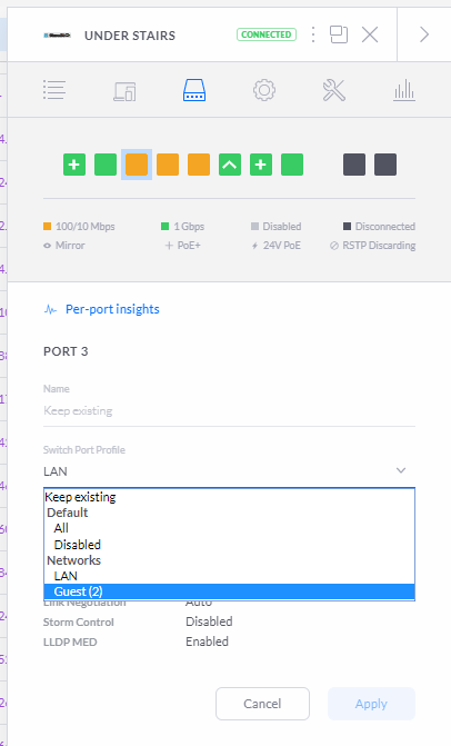 From here I can change the port to use the guest network instead of the main network and apply the settings.