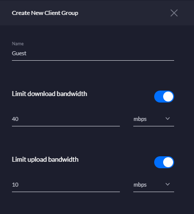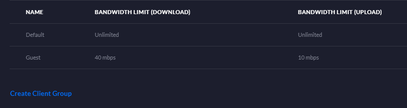 So, you're working from home and the kids are keeping themselves quiet by streaming Netflix, YouTube and generally hogging all of your Internet bandwidth. This isn't so great whilst you're trying to work and you need reliably fast access (remember the post I linked at the beginning about speed?). Fortunately, there's a solution! We can implement some bandwidth restrictions on the guest network so that it can't hog all of the available bandwidth and we can make sure there's plenty left for us to use. Go to Settings, search for Client Groups and click Create Client Group. Give the new group a name, like Guest, and then set some reasonable bandwidth limits based on your available bandwidth.
