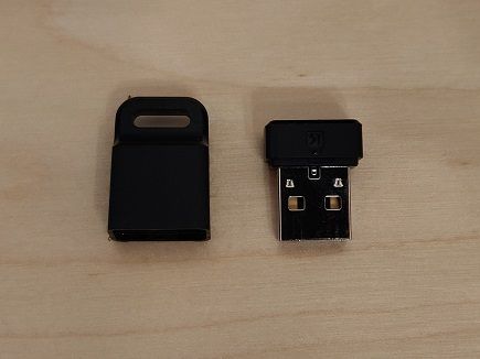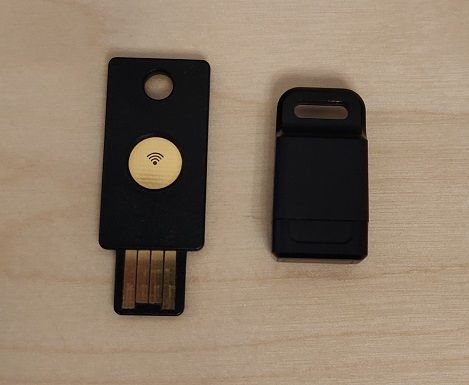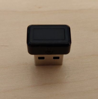 I settled on this particular fingerprint reader but there are many others out there in different form factors too. The reviews online were good, and I hit the order button. Here it is with a YubiKey for size comparison.