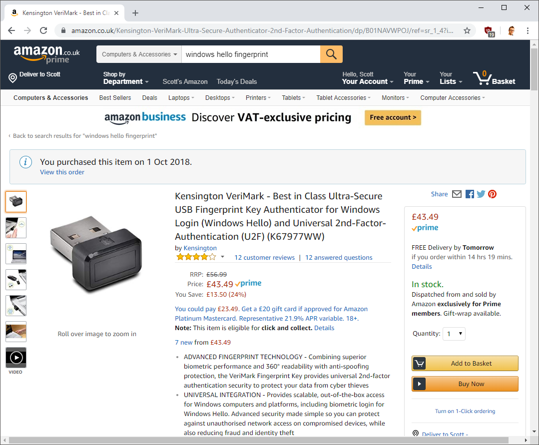 I read reviews of Windows Hello compatible fingerprint readers and was pleasantly surprised to find that they weren't as expensive as I thought they were going to be! This meant I could buy one of these devices and turn my normal desktop PC into a biometric capable device. We've been using fingerprint unlock on our phones for some years now and it fundamentally changed the secure unlock experience. A simple touch of a fingertip is inconsequential given that you have to touch the device to wake it up anyway and compared to typing in even a mediocre password or passphrase it's lightyears ahead in terms of user experience. I wanted to bring the same experience of easy login and great security to my PC, so I picked up fingerprint reader.