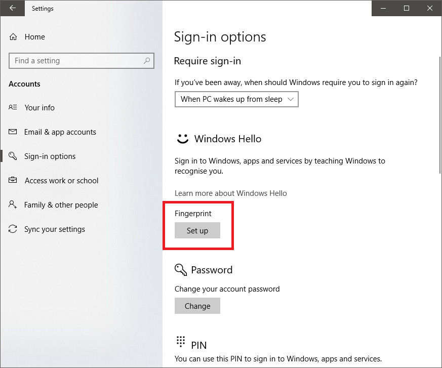You can also set up Windows Hello by heading to Settings -> Accounts -> Sign-in options. You'll see that if you have a compatible fingerprint reader installed there will be a setup prompt.