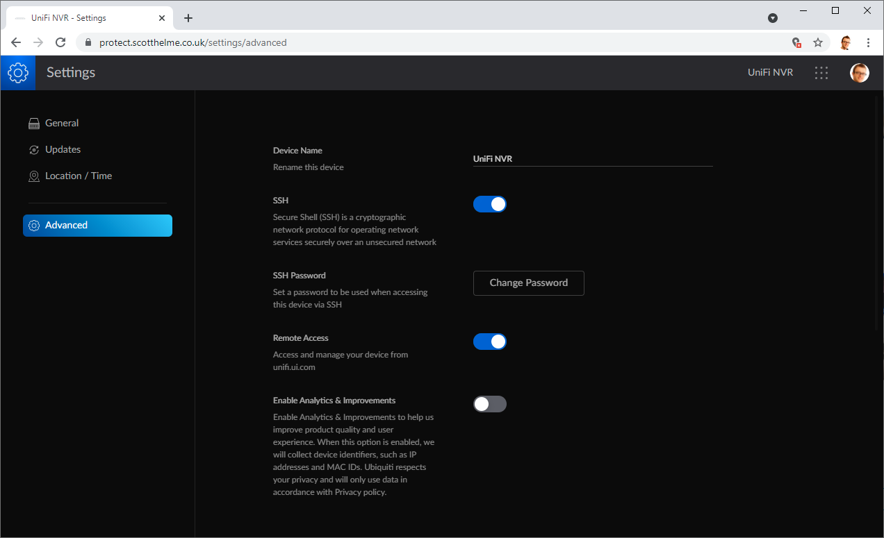 If you need to configure SSH access to your NVR, you can do that from the /settings/advanced menu section: