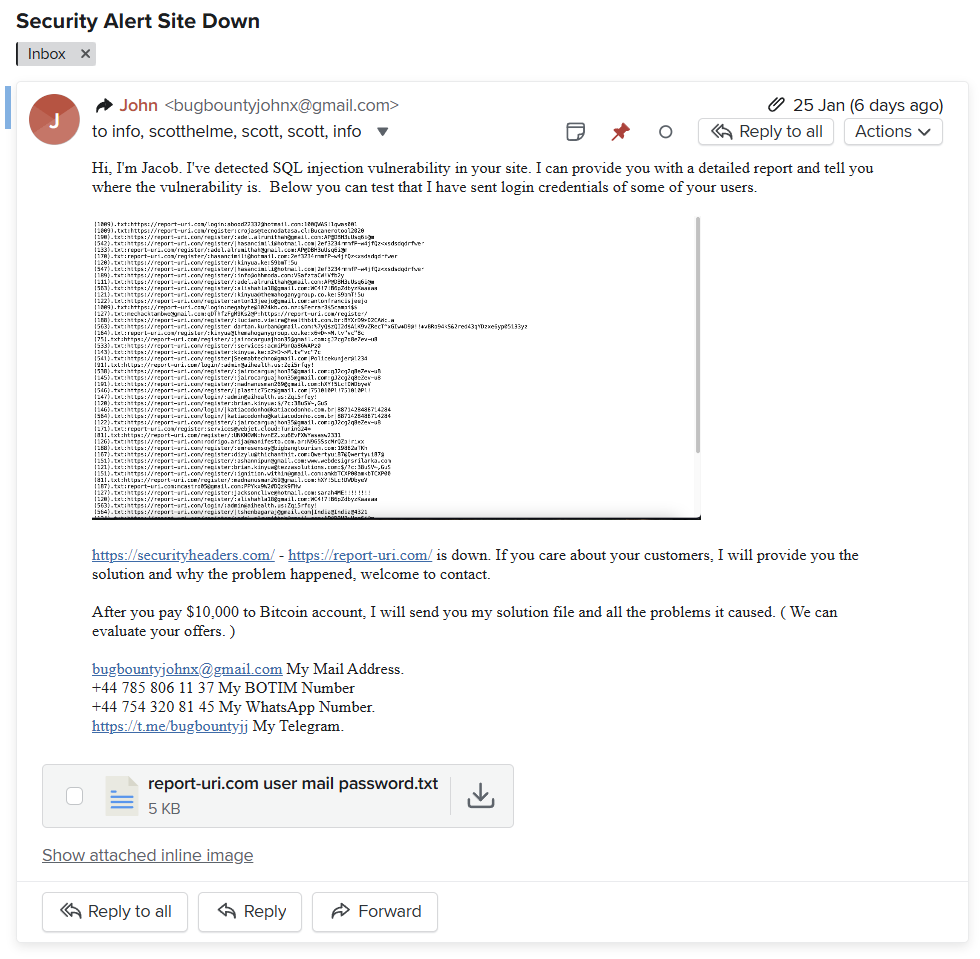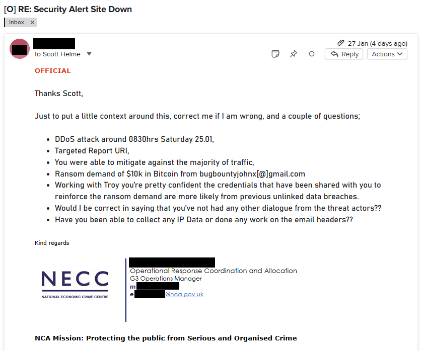 Another interesting twist in this tale, and perhaps the most valuable lesson that many can take away from this, is that we also received a ransom demand during the 25th Jan attack that was clearly nonsense. My guess is that the DDoS attack was a ploy to cause panic and confusion with the goal of rushing us into paying the ransom, a common tactic that the industry sees on a regular basis. Do not fall for these tactics! As the email was sent to my personal email address, I'm sharing it here in my personal capacity for the benefit of everyone. Maybe you've seen the name before, or some of these contact details, or maybe you're just curious what a ransom email might look like!