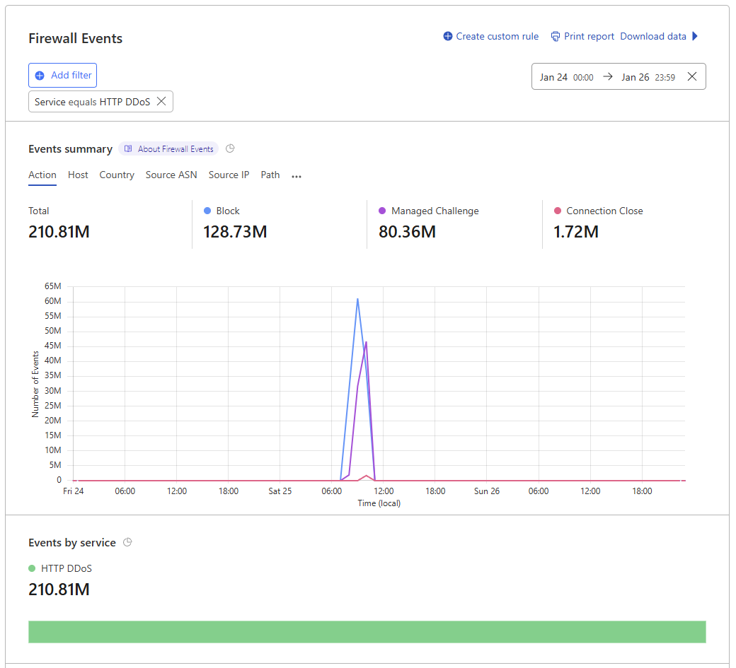 As regular readers will know, we make extensive use of Cloudflare's services at Report URI, from caching and CDN services, to bot and DDoS mitigation, Workers, and more. Whilst we have the DDoS mitigation services in place, no protection is ever 100% effective and, of course, a small portion of the traffic did make it through to our origin servers, causing the issues above. Here are our firewall events for the attack on 25th Jan, showing the quite obvious period of time that the attack took place: