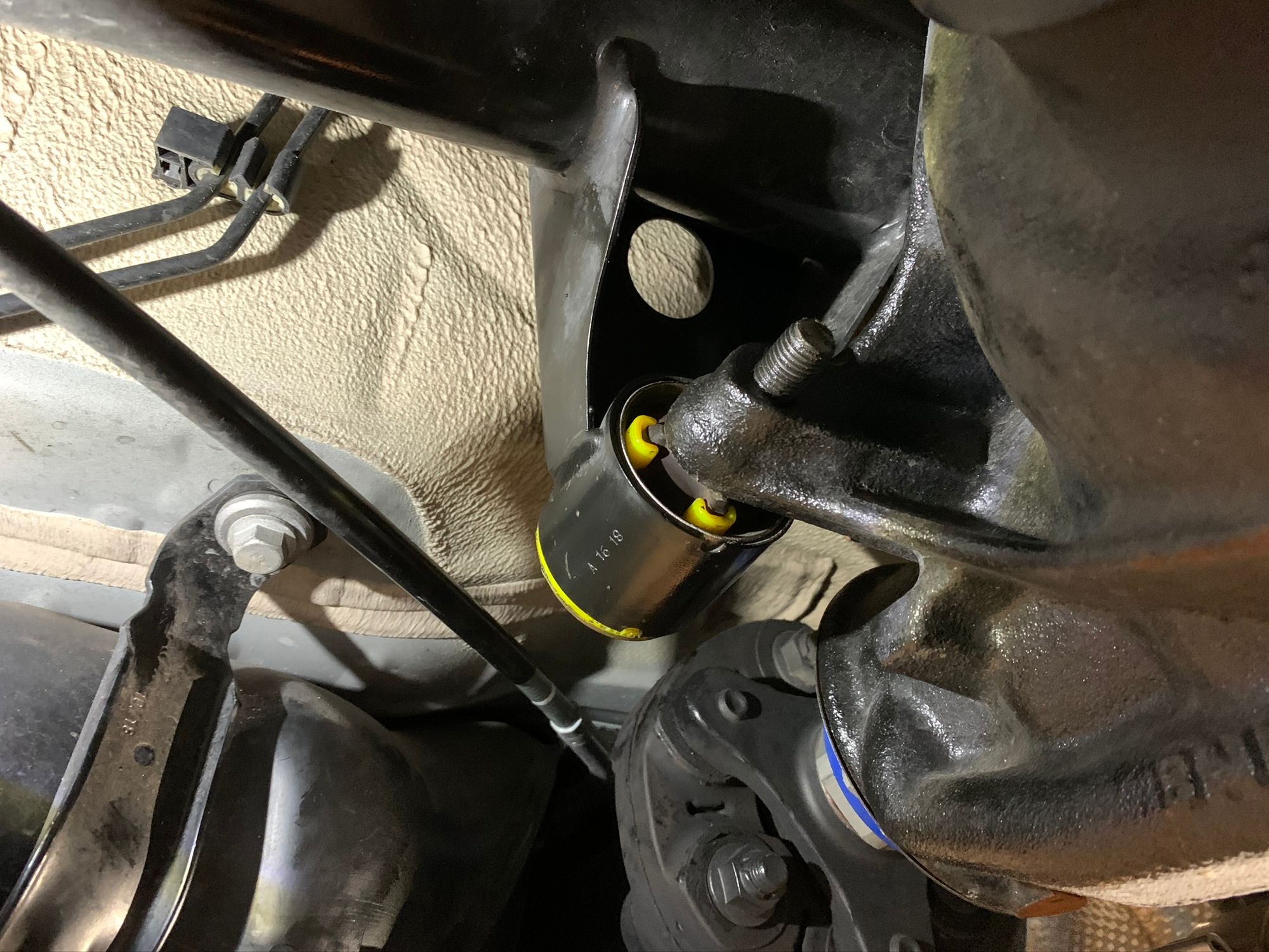 The KC Design braces were fitting back into most of the things we were unbolted and in the example of the subframe bushes there, here is the finished shot with the bolts and the brace in place too. You can see the yellow inserts on each side of this shot.